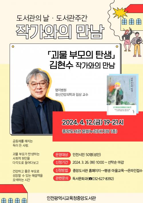 [½Åµ¿¾Æ¹æ¼Û ÀÎõ=À±¹Î½Ä±âÀÚ]ÀÎõ±¤¿ª½Ã±³À°Ã»Áß¾Óµµ¼­°üÀº µµ¼­°üÀÇ ³¯(4¿ù 12ÀÏ)À» ±â³äÇØ ¸¶·ÃÇÑ ±èÇö¼ö ÀÛ°¡¿ÍÀÇ ¸¸³² ¡¸±«¹° ºÎ¸ðÀÇ Åº»ý¡¹ Âü¿©ÀÚ¸¦ 26ÀϺÎÅÍ ¸ðÁýÇÑ´Ù. ±èÇö¼ö ÀÛ°¡´Â Á¤½Å°Ç°­ ÀÇÇÐ ±³¼ö·Î û¼Ò³âµéÀÇ Á¤½Å °Ç°­ ¹®Á¦¸¦ ¿¬±¸Çϰí ÀÖÀ¸¸ç, ±«¡¦