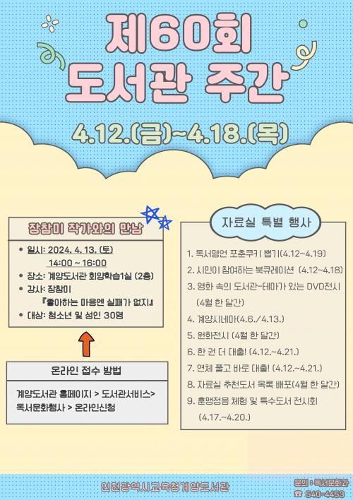 [½Åµ¿¾Æ¹æ¼Û ÀÎõ=À±¹Î½Ä±âÀÚ]ÀÎõ±¤¿ª½Ã±³À°Ã» ¼­±¸µµ¼­°ü(°üÀå ¹ÚÁ¤Èñ)°ú °è¾çµµ¼­°ü(°üÀå ¿ÀÅÂȯ)Àº Á¦60ȸ µµ¼­°ü ÁÖ°£(4.12~4.18.)°ú Á¦2ȸ µµ¼­°üÀÇ ³¯(4.12.)À» ¸Â¾Æ ¡®µµ¼­°ü, ´ç½ÅÀÇ ³»ÀÏÀ» ¼ÒÀå ÁßÀÔ´Ï´Ù¡¯¸¦ ÁÖÁ¦·Î ´Ùä·Î¿î Çà»ç¸¦ ¿î¿µÇÑ´Ù. ¼­±¸µµ¼­°ü¡¦