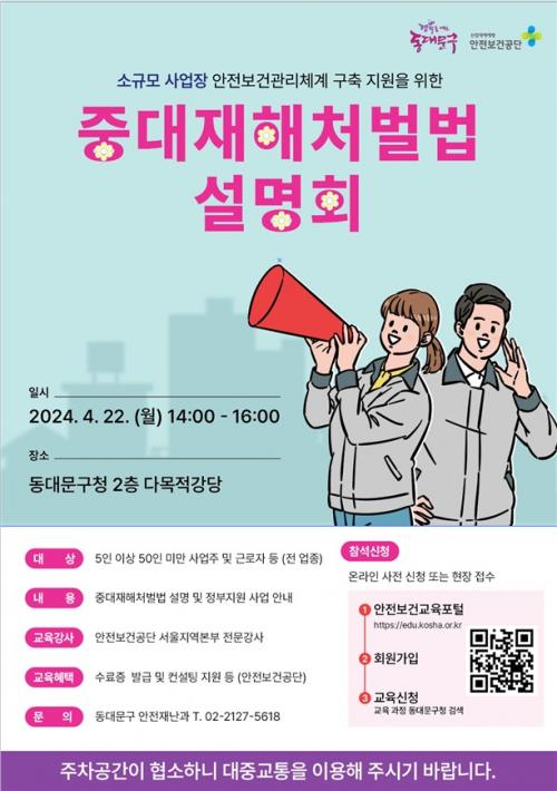 [½Åµ¿¾Æ¹æ¼Û µ¿´ë¹®±¸=À̽ŵ¿±âÀÚ]¼­¿ï µ¿´ë¹®±¸´Â ¿À´Â 22ÀÏ(¿ù) ¿ÀÈÄ 2½Ã ±¸Ã» ´Ù¸ñÀû°­´ç¿¡¼­ °ü³» 5ÀÎ ÀÌ»ó 50ÀÎ ¹Ì¸¸ ¼Ò±Ô¸ð »ç¾÷ÀåÀ» ´ë»óÀ¸·Î Áß´ëÀçÇØÃ³¹ú¹ý ¼³¸íȸ¸¦ °³ÃÖÇÑ´Ù°í ¹àÇû´Ù. ¼­¿ï½Ã´Â ¿ÃÇØ 1¿ù 27ÀϺÎÅÍ 50ÀÎ ¹Ì¸¸ »ç¾÷Àå¿¡µµ Áß´ëÀçÇØÃ³¹ú¹ýÀÌ¡¦