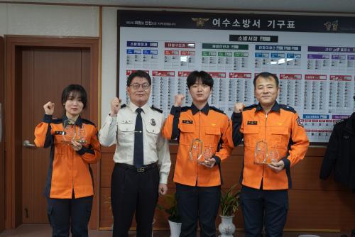 [½Åµ¿¾Æ¹æ¼Û=¿©¼ö À̼±Á¾ ±âÀÚ] ¿©¼ö¼Ò¹æ¼­(¼­Àå ¹Ú¿ø±¹)´Â 16ÀÏ ¿©¼ö¼Ò¹æ¼­ 2Ãþ ¼­Àå½Ç¿¡¼­ ¸Å¿ù º£½ºÆ® ¼Ò¹æ°ø¹«¿øÀ» ¼±¹ßÇϴ¡®´ç½ÅÀÌ ÃÖ°í¡¯ ¼ö¿©½ÄÀ» °³ÃÖÇß´Ù. ¸Å ¿ù ŸÀÇ ¸ð¹üÀÌ µÇ´Â Á÷¿øÀ» ¼±¹ß¡¤½Ã»óÇÏ¿© Àû±ØÇàÁ¤ ¹®È­¸¦ È®»êÇϰí Á÷¿øµéÀÇ ÀÚ±à½É ¡¦
