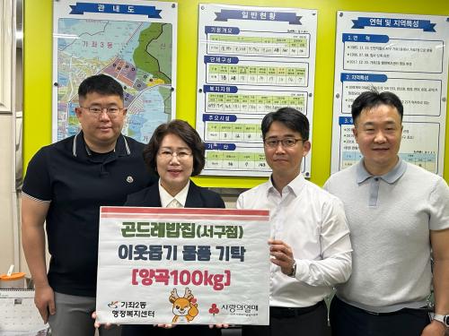 [½Åµ¿¾Æ¹æ¼Û ÀÎõ= À±¹Î½Ä±âÀÚ] °¡ÁÂ2µ¿ ÇàÁ¤º¹Áö¼¾ÅÍ(µ¿Àå À̼­Áø)´Â 5¿ù 27ÀÏ ÀÎõ ¼­±¸ ½É°îµ¿ ¼ÒÀçÀÇ °ïµå·¹¹äÁý ¼­±¸Á¡(´ëÇ¥ ±è¿µÁÖ), Àλý°Ç¾î¹°(´ëÇ¥ °íÇü±â)·ÎºÎÅÍ °¡ÁÂ2µ¿ °ü³» ¾î·Á¿î ÀÌ¿ôÀ» À§ÇÑ ³ª´®À¸·Î ½Ò 100kg¸¦ Àü´Þ¹Þ¾Ò´Ù. °ïµå·¹¹äÁý(¼­±¸Á¡)Àº¡¦