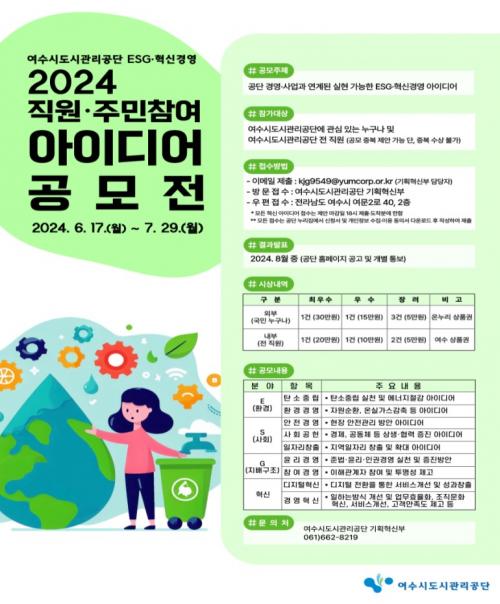 [½Åµ¿¾Æ¹æ¼Û¿©¼ö=±è±â³² ±âÀÚ] ¿©¼ö½Ãµµ½Ã°ü¸®°ø´Ü(ÀÌ»çÀå ±èÀ¯È­)Àº Âü¿©¿Í ¼ÒÅëÀÇ Áö¼Ó°¡´É°æ¿µÀ» ±¸ÇöÇϱâ À§ÇØ ¡®ESG¡¤Çõ½Å°æ¿µ ¾ÆÀ̵ð¾î¡¯ °ø¸ðÀüÀ» °³ÃÖÇÑ´Ù°í ¹àÇû´Ù. °ø¸ð´Â 7¿ù 29ÀϱîÁö¸ç, °ø´Ü ´©¸®Áý¿¡ ¿Ã¶ó¿Â Á¦¾È¼­¸¦ ÀÛ¼ºÇØ À̸ÞÀÏ ¶Ç´Â ¿ìÆí(¹æ¡¦