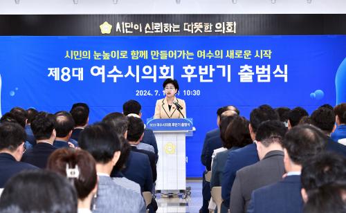 [½Åµ¿¾Æ¹æ¼Û¿©¼ö=±è±â³² ±âÀÚ] ¿©¼ö½ÃÀÇȸ(ÀÇÀå ¹éÀμ÷)´Â 7¿ù 9ÀÏ ÀÇȸ û»ç¿¡¼­ ¹ÝȯÁ¡À» ¸ÂÀº 8´ë ÀÇȸÀÇ ÈĹݱâ Ãâ¹ü½ÄÀ» ¿­°í º»°ÝÀûÀÎ ÈĹݱâ Ȱµ¿ÀÇ ½ÃÀÛÀ» ¾Ë·È´Ù. Ãâ¹ü½Ä¿¡´Â ¹éÀμ÷ ÀÇÀåÀ» ºñ·ÔÇÑ ¿©¼ö½ÃÀÇȸ ÀÇ¿ø, Á¤±â¸í ½ÃÀå, ÀÇÁ¤µ¿¿ìȸ ÀÓ¿ø, ÀÇȸ¡¦