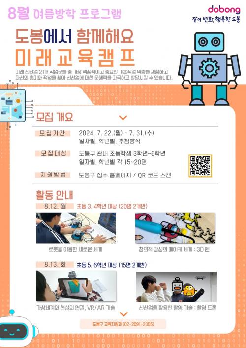 [½Åµ¿¾Æ¹æ¼Û=À̽ŵ¿±âÀÚ] µµºÀ±¸(±¸Ã»Àå ¿À¾ð¼®)°¡ ¿À´Â 8¿ù 12Àϰú 13ÀÏ ÀÌÆ²°£ µµºÀ±¸Ã»¿¡¼­ ÃʵîÇлý 3~6ÇгâÀ» ´ë»óÀ¸·Î ¡®¹Ì·¡±³À°Ä·ÇÁ¡¯¸¦ °³ÃÖÇÑ´Ù. À̹ø Ä·ÇÁ´Â 4Â÷ »ê¾÷ °ü·Ã ¹Ì·¡±â¼ú¿¡ ´ëÇÑ ¾ÆÀ̵éÀÇ ÀÌÇØ¿Í °ü½ÉÀ» ³ôÀ̱â À§ÇØ ¸¶·ÃµÆ´Ù. Ä·ÇÁ´Â ÇС¦