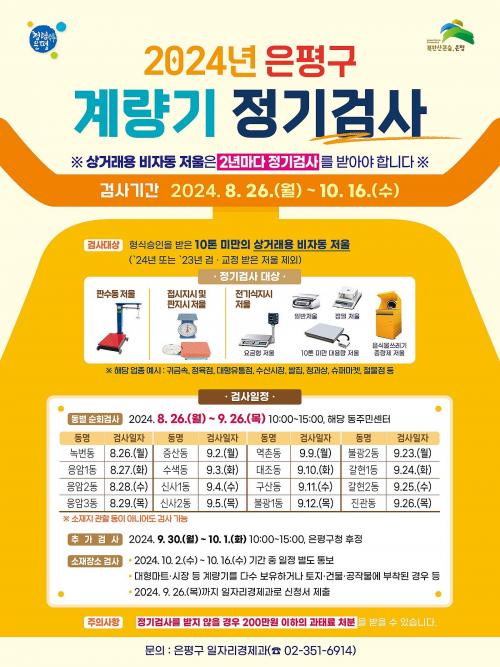 [½Åµ¿¾Æ¹æ¼Û=À̽ŵ¿±âÀÚ] ÀºÆò±¸(±¸Ã»Àå ±è¹Ì°æ)´Â »ó°Å·¡ÀÇ °øÁ¤¼º È®º¸¸¦ À§ÇØ ¿À´Â 26ÀϺÎÅÍ 10¿ù 16ÀϱîÁö ¡®2024³â °è·®±â Á¤±â°Ë»ç¡¯¸¦ ½Ç½ÃÇÑ´Ù°í ¹àÇû´Ù. ¡®°è·®±â Á¤±â°Ë»ç¡¯´Â ¡¸°è·®¿¡ °üÇÑ ¹ý·ü¡¹¿¡ µû¶ó °è·®±âÀÇ Á¤È®µµ¸¦ À¯ÁöÇÏ°í ºÒ¹ý °è·®±âÀÇ »ç¿ë¡¦