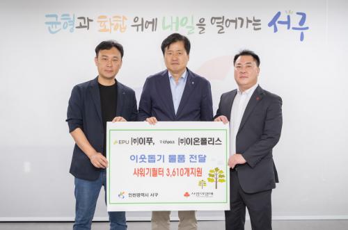 [½Åµ¿¾Æ¹æ¼Û ÀÎõ= À±¹Î½Ä±âÀÚ] ÀÎõ ¼­±¸(±¸Ã»Àå °­¹ü¼®)´Â 8¿ù 13ÀÏ ¢ßÀÌǪ(´ëÇ¥ÀÌ»ç ±èÀçÁØ), ¢ßÀÌ¿ÂÆú¸®½º(´ëÇ¥ÀÌ»ç Ȳ±ÔÁø)·ÎºÎÅÍ ÀÌ¿ô»ç¶û ¹°Ç°(»þ¿ö±âÇÊÅÍ) 3,610°³¸¦ ±âŹ¹Þ¾Ò´Ù. À̳¯ Àü´Þ¹ÞÀº »þ¿ö±âÇÊÅÍ´Â ¼­±¸ ³» ³ëÀκ¹Áö°ü ¹× Àú¼ÒµæÁֹο¡°Ô Áö¿øµÉ ¿¹¡¦