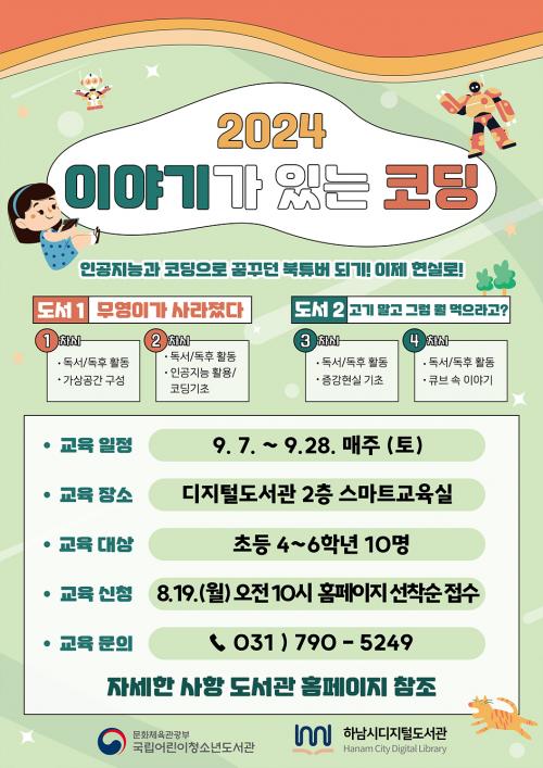 [½Åµ¿¾Æ¹æ¼Û=À̽ŵ¿±âÀÚ]Çϳ²½Ã(½ÃÀå ÀÌÇöÀç)´Â ¿À´Â 8¿ù 19ÀÏ ¿ÀÀü 10½ÃºÎÅÍ ¡®2024 À̾߱Ⱑ ÀÖ´Â ÄÚµù¡¯ ÇÁ·Î±×·¥¿¡ Âü¿©ÇÒ ÃʵîÇб³ °íÇгâ Çлý 10¸íÀ» ¼±Âø¼ø ¸ðÁýÇÑ´Ù. ±¹¸³¾î¸°ÀÌû¼Ò³âµµ¼­°üÀÌ ÁÖ°üÇÏ´Â ¡®2024 À̾߱Ⱑ ÀÖ´Â ÄÚµù¡¯Àº Çϳ²½ÃµðÁöÅеµ¼­°ü¡¦