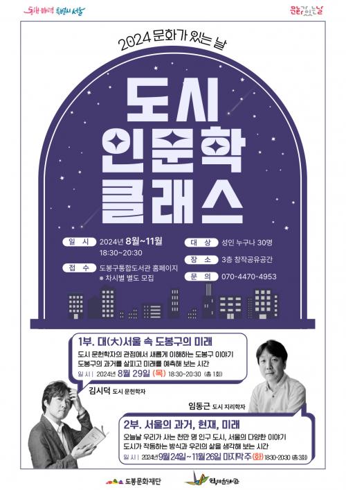 [½Åµ¿¾Æ¹æ¼Û=À̽ŵ¿±âÀÚ]µµºÀ±¸(±¸Ã»Àå ¿À¾ð¼®) µµºÀ¹®È­Àç´Ü Çи¶À»µµ¼­°üÀº 2024 ¹®È­°¡ ÀÖ´Â ³¯ ÇÏ¹Ý±â Æ¯ÁýÀ¸·Î ¡®µµ½Ã Àι®ÇРŬ·¡½º¡¯¸¦ ¿î¿µÇÑ´Ù°í ¹àÇû´Ù. ¡®µµ½Ã Àι®ÇРŬ·¡½º¡¯´Â ´ëµµ½Ã ¼­¿ïÀ» ½ÉÃþÀûÀ¸·Î ޱ¸ÇÏ´Â Àι®ÇÐ °­Á´Ù. 1ºÎ ¡®´ë(ÓÞ)¼­¿ï ¼Ó ¡¦