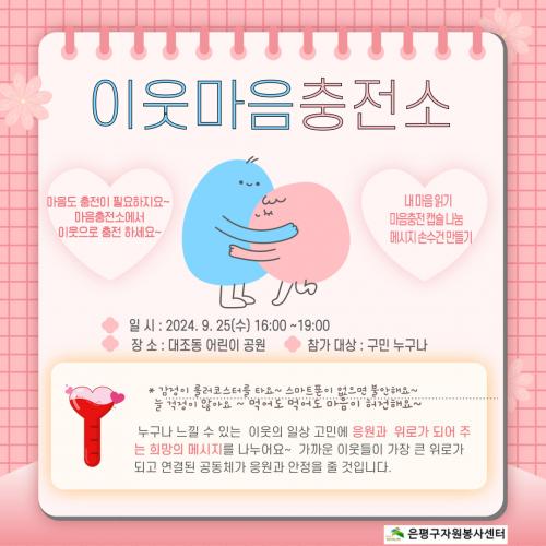 ÀºÆò±¸ ±¸Ã»Àå ±è¹Ì°æÀº ¿À´Â 25ÀÏ ´ëÁ¶¾î¸°À̰ø¿ø¿¡¼­ ÀÌ¿ô °£ ¼­·Î ¸¶À½À» µ¹º¸´Â ÀÚ¿øºÀ»ç ÇÁ·Î±×·¥ÀÎ ¡®ÀÌ¿ô¸¶À½ ÃæÀü¼Ò¡¯¸¦ ¿î¿µÇÑ´Ù°í ¹àÇû´Ù.¤· ¡®ÀÌ¿ô¸¶À½ ÃæÀü¼Ò¡¯´Â ´©±¸³ª ÇÑ ¹øÂë °æÇèÇßÀ» ÀÏ»óÀÇ °í¹Î°ú À̸¦ °ø°¨ÇÏ´Â ÀÌ¿ôµéÀÌ µûµíÇÑ ÀÀ¿ø°ú Èñ¸Á ¸Þ½Ã¡¦