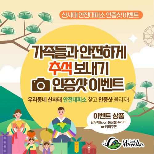 [½Åµ¿¾Æ¹æ¼Û=ÀÌ¿ø¼º±âÀÚ]ÇԾȱºÀº ´Ù°¡¿À´Â Ãß¼®À» ¸Â¾Æ ¡®°¡Á·µé°ú ¾ÈÀüÇÑ Ãß¼®º¸³»±â ÀÎÁõ¼¦ À̺¥Æ®¡¯¸¦ 13ÀÏ(±Ý)ºÎÅÍ 20ÀÏ(±Ý)±îÁö ÇԾȱº SNS(ÀνºÅ¸±×·¥)¿¡¼­ °³ÃÖÇÑ´Ù°í ¹àÇû´Ù. À̹ø À̺¥Æ®´Â »ê»çÅÂ¿Í °°Àº ÀÚ¿¬ÀçÇØ¿¡ ´ëºñÇØ ´ëÇǼҸ¦ »çÀü¿¡ È®ÀÎÇϰí, °¡¡¦