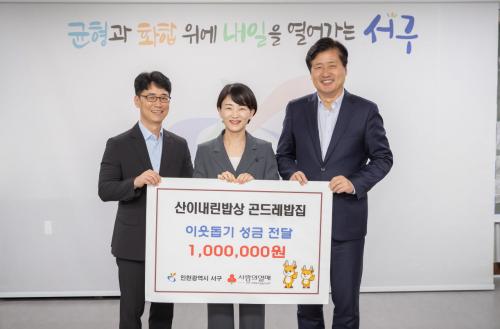 [½Åµ¿¾Æ¹æ¼Û ÀÎõ= À±¹Î½Ä±âÀÚ] ÀÎõ ¼­±¸(±¸Ã»Àå °­¹ü¼®)´Â 9¿ù 20ÀÏ, »êÀ̳»¸°¹ä»ó °ïµå·¹¹äÁý(°øµ¿´ëÇ¥ ±èÁÖ¸®, ±è¿µÁÖ)À¸·ÎºÎÅÍ ÀÌ¿ôµ½±â ¼º±Ý 100¸¸¿øÀ» Àü´Þ¹Þ¾Ò´Ù. À̳¯ Àü´Þ¹ÞÀº ¼º±ÝÀº ÀÎõ»çȸº¹Áö°øµ¿¸ð±Ýȸ¸¦ ÅëÇØ ¼­±¸ Àú¼ÒµæÁÖ¹ÎÀ» À§ÇØ ¾²ÀÏ ¿¹Á¤¡¦