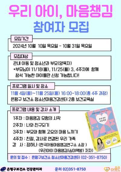 [½Åµ¿¾Æ¹æ¼Û ÀºÆò±¸=À̽ŵ¿±âÀÚ] ÀºÆò±¸(±¸Ã»Àå ±è¹Ì°æ)´Â ¿À´Â 31ÀϱîÁö °ü³» ¾Æµ¿¡¤Ã»¼Ò³â°ú ºÎ¸ð ¶Ç´Â ¾çÀ°ÀÚ ´ë»ó ¡®¿ì¸®¾ÆÀÌ, ¸¶À½Ã¬±è¡¯ ÇÁ·Î±×·¥ Âü°¡ÀÚ¸¦ ¸ðÁýÇÑ´Ù°í ¹àÇû´Ù. ¡®¿ì¸®¾ÆÀÌ, ¸¶À½Ã¬±è¡¯ ÇÁ·Î±×·¥Àº ½ÇÆÐ¿Í °¥µîÀ» °Þ±â ½ÃÀÛÇÑ ¾ÆÀ̵é°ú ºÎ¸ð ¶Ç¡¦