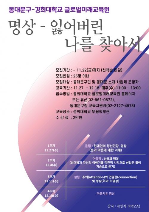 [½Åµ¿¾Æ¹æ¼Û µ¿´ë¹®±¸=À̽ŵ¿±âÀÚ] µ¿´ë¹®±¸°¡ °æÈñ´ëÇб³ ±Û·Î¹ú¹Ì·¡±³À°¿ø°ú Çù·ÂÇØ ¿î¿µÇÏ´Â ¡®¸í»ó-ÀÒ¾î¹ö¸° ³ª¸¦ ã¾Æ¼­¡¯¿Í ¡®¹®È­´ä»ç-Èı⠹éÁ¦ÀÇ ¿ª»ç¿Í ¹®¸í, ºÎ¿©¡¯ °­ÁÂÀÇ ¼ö°­»ýÀ» ¼±Âø¼øÀ¸·Î ¸ðÁýÇÑ´Ù. ¡®¸í»ó-ÀÒ¾î¹ö¸° ³ª¸¦ ã¾Æ¼­¡¯ °­Á´ À̷аú ½Ç¡¦