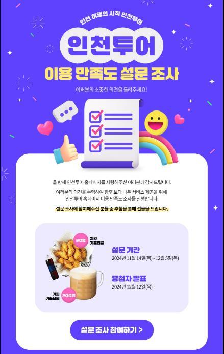 [½Åµ¿¾Æ¹æ¼Û ÀÎõ= À±¹Î½Ä±âÀÚ] ÀÎõ±¤¿ª½Ã(½ÃÀå À¯Á¤º¹)´Â ÀÎõÅõ¾î ´©¸®Áý(itour.incheon.go.kr)ÀÇ ±â´É °³¼±À» À§ÇÑ ½Ã¹Î ´ë»ó ¿Â¶óÀÎ ¼³¹® Á¶»ç¸¦ ÁøÇàÇÑ´Ù°í ¹àÇû´Ù. ¼³¹® Á¶»ç´Â 11¿ù 14ÀϺÎÅÍ 12¿ù 5ÀϱîÁö ÃÑ 3ÁÖ°£ ÁøÇàµÇ¸ç Áö¿ª Á¦ÇÑ ¾øÀÌ ÀÎõÅõ¾î ´©¸®¡¦