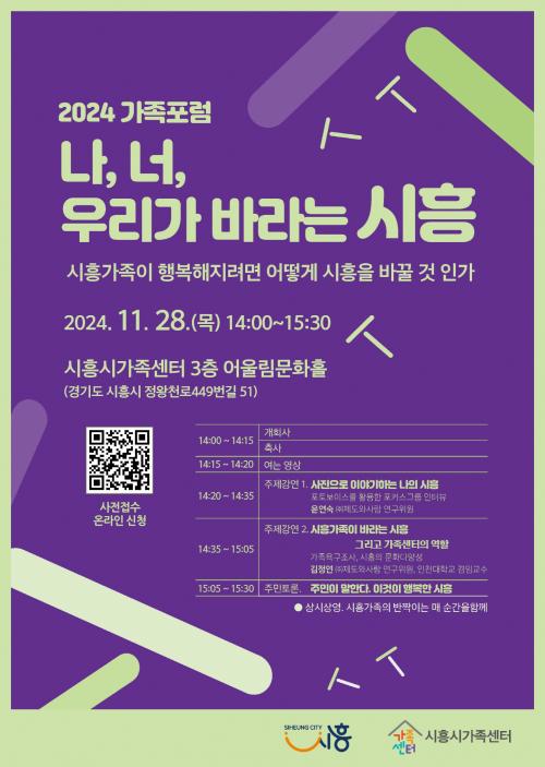 [½Åµ¿¾Æ¹æ¼Û ½ÃÈï½Ã=À̽ŵ¿±âÀÚ] ½ÃÈï½Ã°¡Á·¼¾ÅÍ ¾î¿ï¸²¹®È­È¦¿¡¼­ ¿À´Â 11¿ù 28ÀÏ ¡®2024³â °¡Á· Æ÷·³¡¯ÀÌ ¿­¸°´Ù. À̹ø Æ÷·³Àº ¡®³ª, ³Ê, ¿ì¸®°¡ ¹Ù¶ó´Â ½ÃÈï-½ÃÈï°¡Á·ÀÌ Çàº¹ÇØÁö·Á¸é ¾î¶»°Ô ½ÃÈïÀ» ¹Ù²Ü °ÍÀΰ¡?¡¯¶ó´Â ÁÖÁ¦·Î, ½Ã¹ÎµéÀÇ °¡Á· ¼­ºñ½º ¿å±¸¿Í ½ÃÈïÀÇ ¡¦