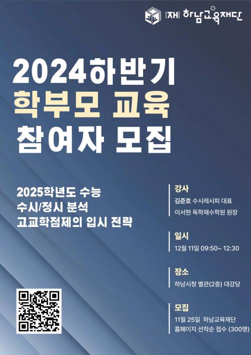 [½Åµ¿¾Æ¹æ¼Û Çϳ²½Ã=À̽ŵ¿±âÀÚ] Çϳ²±³À°Àç´ÜÀº ¿À´Â 12¿ù 11ÀÏ ¿­¸®´Â ¡®2024³â ÇϹݱâ Çкθ𠱳À°-2025Çг⵵ ¼ö´É ºÐ¼® ¹× ¼ö½Ã¡¤Á¤½Ã Àü·« ¼³¸íȸ¡¯¿¡ Âü¼®ÇÒ Âü¿© Èñ¸ÁÀÚ 300¸íÀ» ÀÌ´Þ 25ÀϺÎÅÍ ¼±Âø¼ø ¸ðÁýÇÑ´Ù°í ¹àÇû´Ù. (Àç)Çϳ²±³À°Àç´ÜÀÌ ÁÖÃÖÇÏ´Â À̹ø¡¦