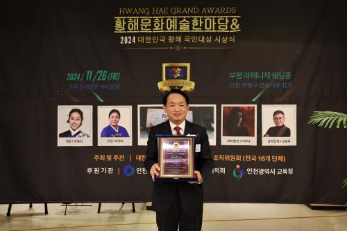[½Åµ¿¾Æ¹æ¼Û ÀÎõ= À±¹Î½Ä±âÀÚ] ±èÂùÁø ÀÎõ µ¿±¸Ã»ÀåÀÌ 26ÀÏ ¡®È²Çع®È­¿¹¼ú ÇѸ¶´ç ¹× 2024 ´ëÇѹα¹ È²ÇØ ±¹¹Î´ë»ó¡¯ ½Ã»ó½Ä¿¡¼­ ¿ì¼öÇàÁ¤ºÎ¹®À» ¼ö»óÇß´Ù. ¡®2024 ´ëÇѹα¹ È²ÇØ ±¹¹Î´ë»ó¡¯Àº È²ÇØ±³À°¹®È­Àç´Ü°ú ±³À°ºÎ°øÀιýÀÎ Çѱ¹Æò»ý±³À°±â±¸°¡ ÁÖÃÖÇϰí,¡¦
