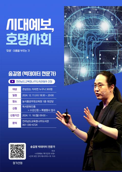 [½Åµ¿¾Æ¹æ¼Û Àü³²³ªÁÖ=À̽ŵ¿±âÀÚ] Àü¶ó³²µµ±³À°Ã»³ªÁÖµµ¼­°üÀº ¿À´Â 12¿ù 11ÀÏ(¼ö) 18½Ã 30ºÐ¿¡ ³ó½Äǰ°ø¹«¿ø±³À°¿ø ´ë°­´ç¿¡¼­ ºòµ¥ÀÌÅÍ Àü¹®°¡ ¼Û±æ¿µ ÀÛ°¡¸¦ ÃÊû, Ưº° °­¿¬À» °³ÃÖÇÑ´Ù. À̹ø °­¿¬Àº ºü¸£°Ô º¯È­ÇÏ´Â µðÁöÅÐ ½Ã´ë ¼Ó¿¡¼­ ºòµ¥ÀÌÅ͸¦ ÅëÇØ »çȸ¡¦