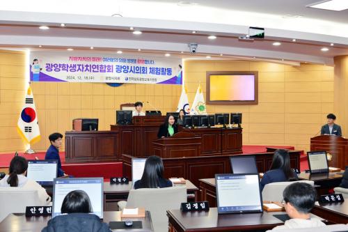 [½Åµ¿¾Æ¹æ¼Û Àü³²±¤¾ç=À̽ŵ¿±âÀÚ] ±¤¾ç±³À°Áö¿øÃ»Àº Áö³­ 12¿ù 18ÀÏ(¼ö) ±¤¾ç½ÃÀÇȸ¿¡¼­ ÇлýÀÚÄ¡¿¬ÇÕȸ ÇлýµéÀ» ´ë»óÀ¸·Î û¼Ò³âÀÇȸüÇèÀ» ½Ç½ÃÇß´Ù°í ¹àÇû´Ù. À̳¯ üÇèÀº ½ÃÀÇȸ È«º¸¿µ»ó ½Ãû°ú ÇÔ²², ±¤¾ç½ÃÀÇȸÀÇ ¿ªÇÒ¿¡ ´ëÇÑ ÀåÅñ٠ÁÖ¹«°üÀÇ ¼³¸íÀ¸·Î ½Ã¡¦