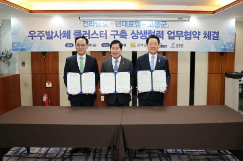 [½Åµ¿¾Æ¹æ¼Û Àü³²°íÈï=¹Ú±¤¿Á±âÀÚ] °íÈﱺ(±º¼ö °ø¿µ¹Î)Àº 20ÀÏ ¼­¿ï ÄÚ¸®¾Æ³ªÈ£ÅÚ »çÆÄÀ̾îȦ¿¡¼­ Àü³²µµ¡¤Çö´ë·ÎÅÛ°ú ¿ìÁֹ߻çü »ê¾÷ Ŭ·¯½ºÅÍÀÇ ¼º°øÀû ±¸ÃàÀ» À§ÇÑ 3ÀÚ °£ ¾÷¹«Çù¾àÀ» ü°áÇß´Ù°í ¹àÇû´Ù. À̳¯ Çù¾à½Ä¿¡´Â °ø¿µ¹Î °íÈﱺ¼ö, ±è¿µ·Ï µµÁö»ç, À̿롦
