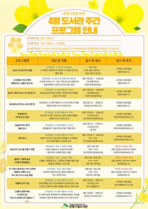 [½Åµ¿¾Æ¹æ¼Û ÀºÆò±¸=À̽ŵ¿±âÀÚ] ÀºÆò±¸´Â ¿À´Â 12ÀϺÎÅÍ 18ÀϱîÁö ¡®µµ¼­°ü ÁÖ°£¡¯À» ¸Â¾Æ Áö¿ª ÁֹεéÀ» À§ÇÑ ´Ù¾çÇÑ µ¶¼­¹®È­ ÇÁ·Î±×·¥À» ÀºÆò±¸¸³µµ¼­°ü¿¡¼­ ¿î¿µÇÑ´Ù°í ¹àÇû´Ù. ¡®µµ¼­°ü ÁÖ°£¡¯Àº Çѱ¹µµ¼­°üÇùȸ°¡ µµ¼­°üÀÇ »çȸÀû °¡Ä¡¿Í Çʿ伺À» ³Î¸® ¾Ë¸®°í¡¦