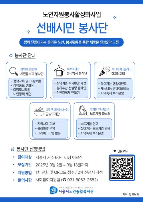[½Åµ¿¾Æ¹æ¼Û ½ÃÈï½Ã=À̽ŵ¿±âÀÚ] ½ÃÈï½Ã³ëÀÎÁ¾ÇÕº¹Áö°üÀº º¸°Çº¹ÁöºÎ¿Í Çѱ¹³ëÀÎÁ¾ÇÕº¹Áö°üÇùȸ°¡ ÁÖ°üÇÏ´Â ¡®2026³â ³ëÀÎÀÚ¿øºÀ»ç Ȱ¼ºÈ­ Áö¿ø»ç¾÷¡¯¿¡ ¼±Á¤µÅ, Áö¿ª»çȸ¿¡ À̹ÙÁöÇϰíÀÚ ÇÏ´Â 60¼¼ ÀÌ»ó ³ëÀÎÀ» ´ë»óÀ¸·Î ¼±¹è½Ã¹Î ºÀ»ç´ÜÀ» ¿î¿µÇÑ´Ù. ¡®¼±¹è½Ã¹Î ºÀ¡¦