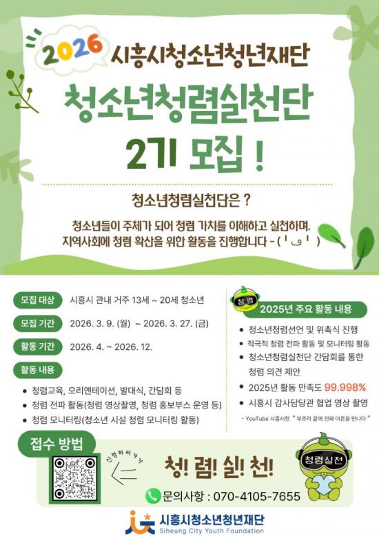[½Åµ¿¾Æ¹æ¼Û ½ÃÈï½Ã=À̽ŵ¿±âÀÚ] ½ÃÈï½Ã´Â ½ÃÈï½Ãû¼Ò³âû³âÀç´ÜÀÌ Ã»¼Ò³âÀÇ Ã»·Å ÀǽÄÀ» ³ôÀ̰í Áö¿ª»çȸ¿¡ û·Å ¹®È­¸¦ È®»êÇϱâ À§ÇØ ¡®2026³â û¼Ò³âû·Å½Çõ´Ü 2±â¡¯ ½Å±Ô´Ü¿øÀ» 5¸í ¸ðÁýÇÑ´Ù°í ¹àÇû´Ù. û¼Ò³âû·Å½Çõ´ÜÀº û¼Ò³âÀÌ Ã»·ÅÀÇ °¡Ä¡¸¦ ÀÌÇØÇϰí, ÀÌ¡¦