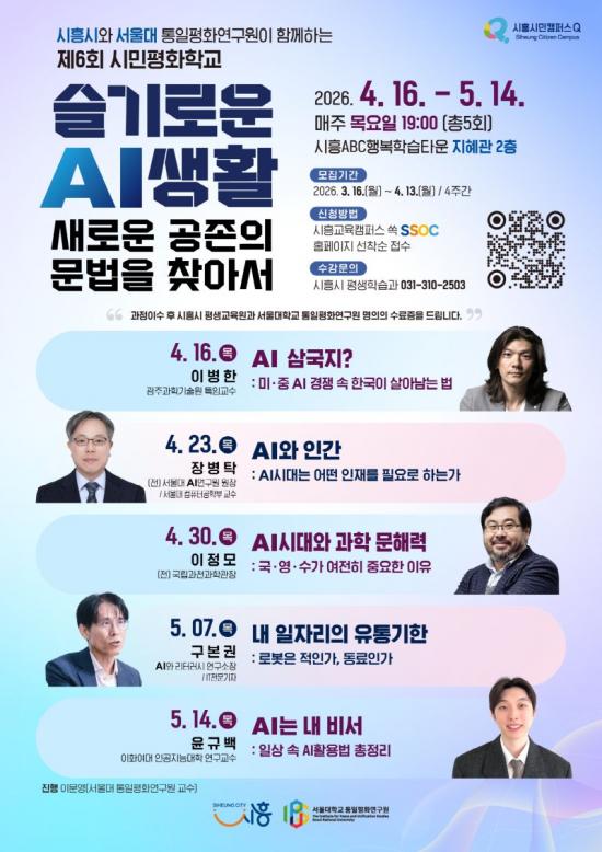[½Åµ¿¾Æ¹æ¼Û ½ÃÈï½Ã=À̽ŵ¿±âÀÚ] ½ÃÈï½Ã´Â ¿À´Â 4¿ù 16ÀϺÎÅÍ 5¿ù 14ÀϱîÁö ¸ÅÁÖ ¸ñ¿äÀÏ Àú³á 7½Ã, ½ÃÈïABCÇູÇнÀŸ¿î ÁöÇý°ü 2Ãþ¿¡¼­ ¡®Á¦6ȸ ½Ã¹ÎÆòÈ­Çб³¡¯¸¦ ¿î¿µÇÑ´Ù. À̹ø ½Ã¹ÎÆòÈ­Çб³´Â ¡®½½±â·Î¿î ÀΰøÁö´É »ýȰ: »õ·Î¿î °øÁ¸ÀÇ ¹®¹ýÀ» ã¾Æ¼­¡¯¸¦ ÁÖÁ¦·Î¡¦